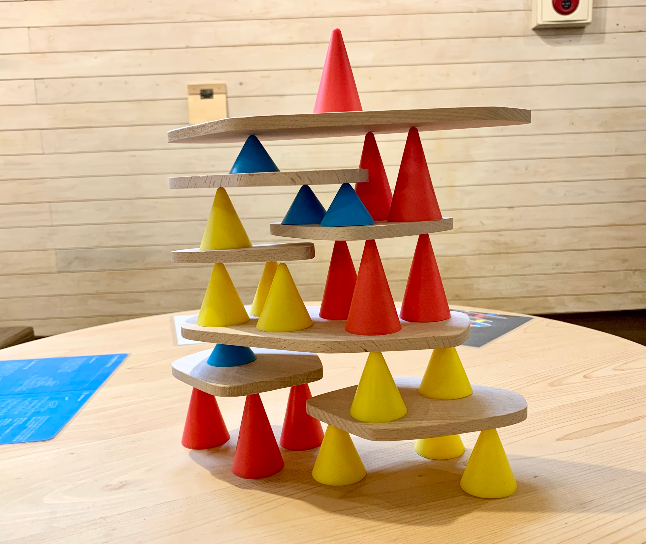 大きさの違うシリコン製のコーンと木製プレートを重ねていきます。