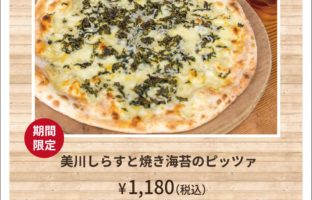 『美川シラスと焼き海苔のピッツァ』 1180円 6月1日(木)~6月30日(金) 昨年も大好評いただいたピッツァ! 焼き海苔の香ばしい風味と「美川シラス…